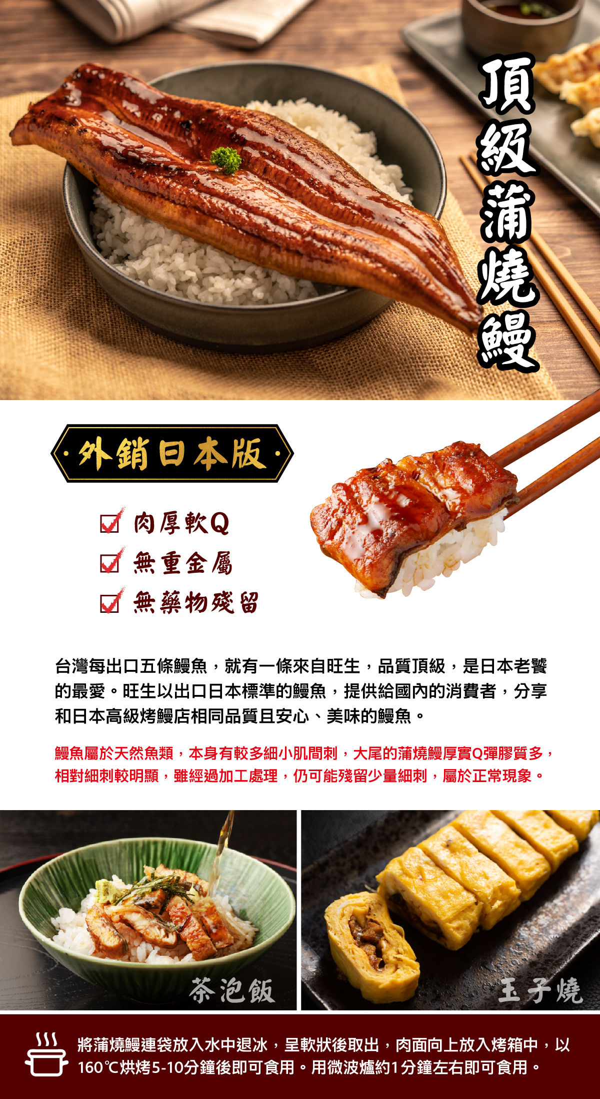 3.出口鰻魚要經過多次藥物檢驗,才能安全進入日本市場販賣,以出口日本標準的鰻魚,提供給國內消費者,分享和日本高級烤鰻店相同品質的美味鰻魚。