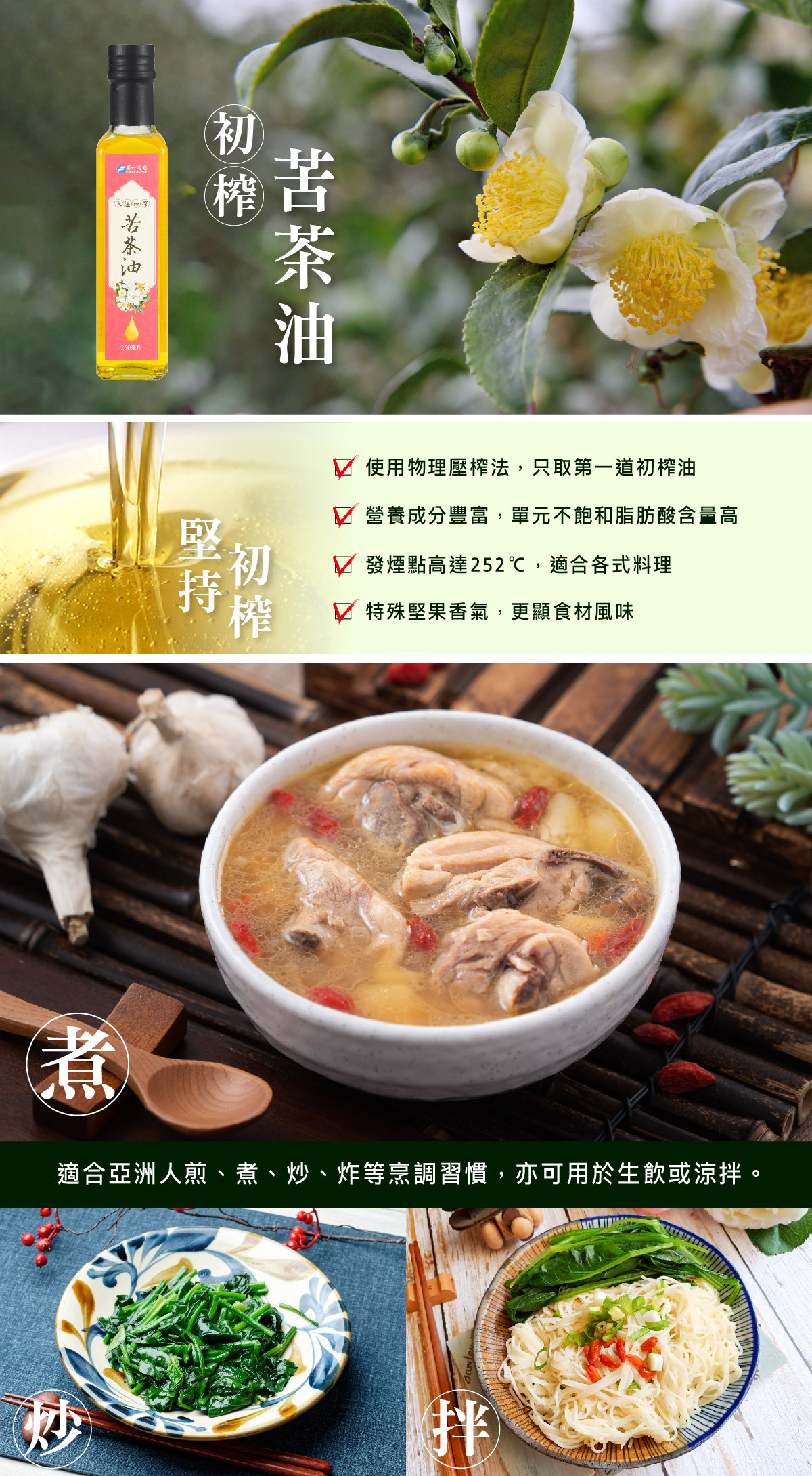 (4)苦茶油發煙點高達252℃,適合亞洲人煎、煮、炒、炸等烹調習慣,亦可用於生飲或涼拌。