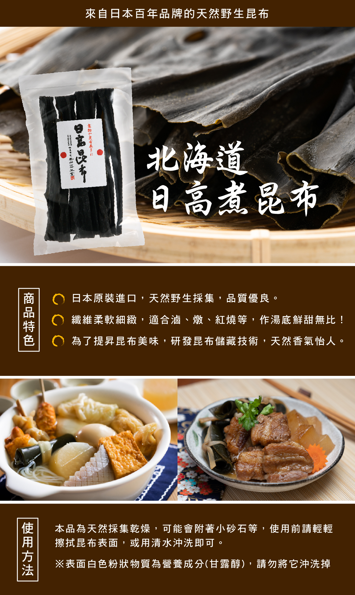 2.昆布上面白色粉狀物質部份為營養成分(甘露醇),請勿將它沖洗掉。