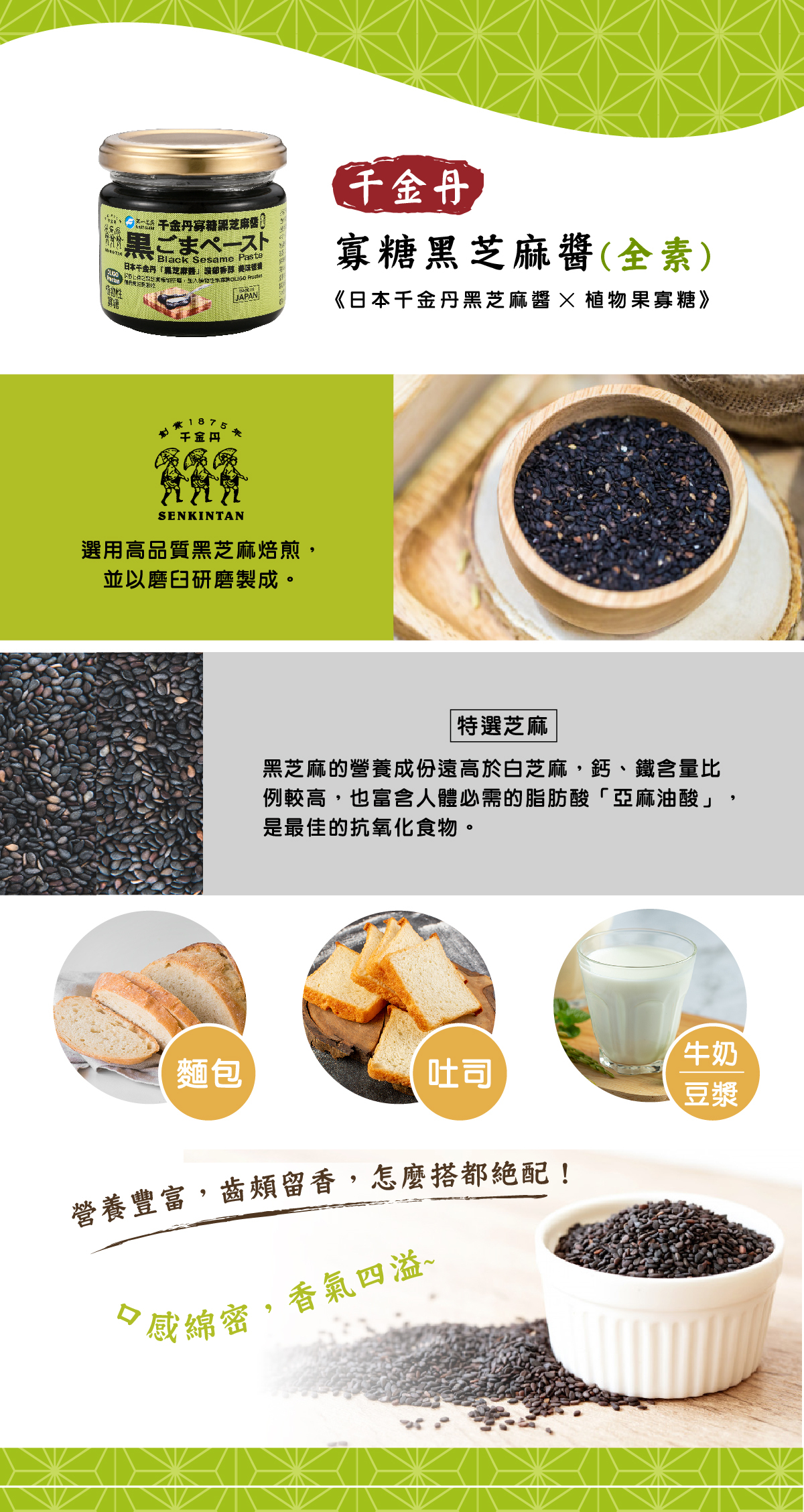 1. 來自四國香川縣,百年老店的千金丹黑芝麻醬,精挑特選芝麻為原料,極細研磨而成。