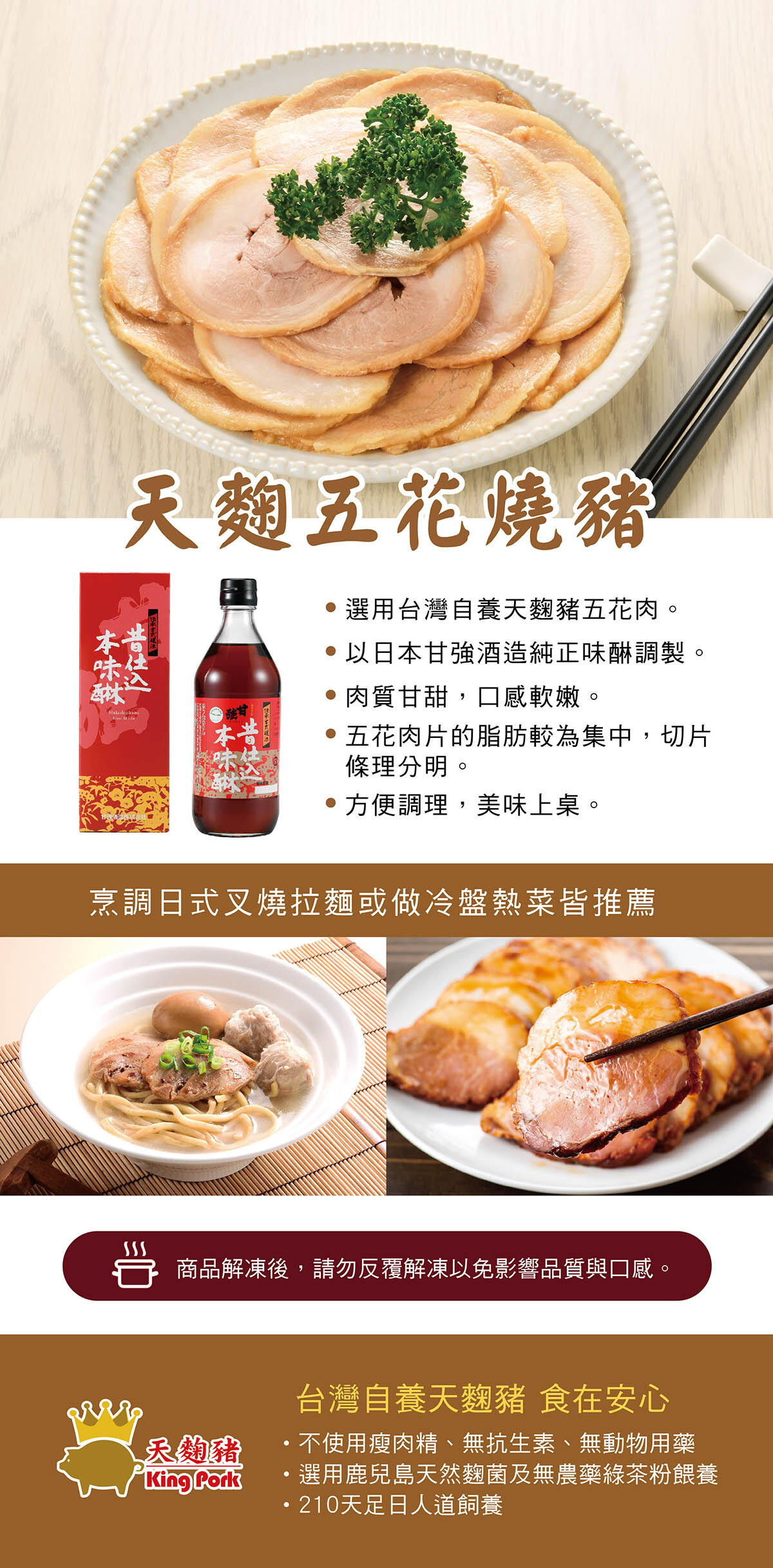美味的天五花燒豬,可用於拉麵上的叉燒肉,或做冷盤熱菜的燒豬料理,天麴豬五花肉,不惜成本使用日本純正味醂調製,肉質甘甜口感軟嫩,五花肉切片條理分明。