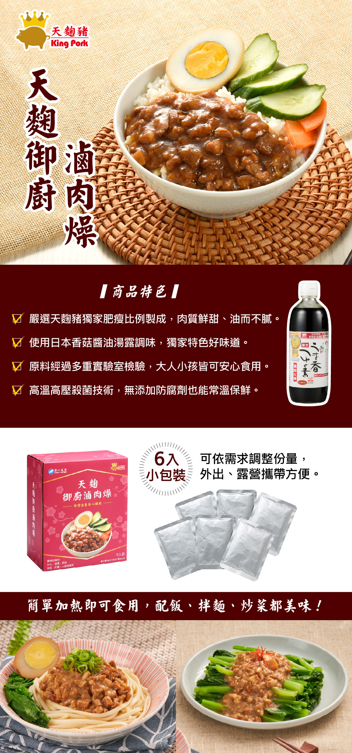 成 分:水、天麴豬肉丁、香菇醬油湯露{純釀造醬油(大豆、小麥、食鹽)、水、糖類(砂糖、果糖葡萄糖糖漿)、水解蛋白(大豆、玉米)、食鹽、鰹柴魚片、香菇萃取物、昆布萃取物、調味劑(L-麩酸鈉)、酒精、普通焦糖色素}、紅蔥頭、洋蔥、豬油皮肉丁、大豆沙拉油、蒜、蔥頭酥(蔥頭乾、精製棕櫚油)、乙醯化己二酸二澱粉、砂糖、食鹽、白胡椒粉