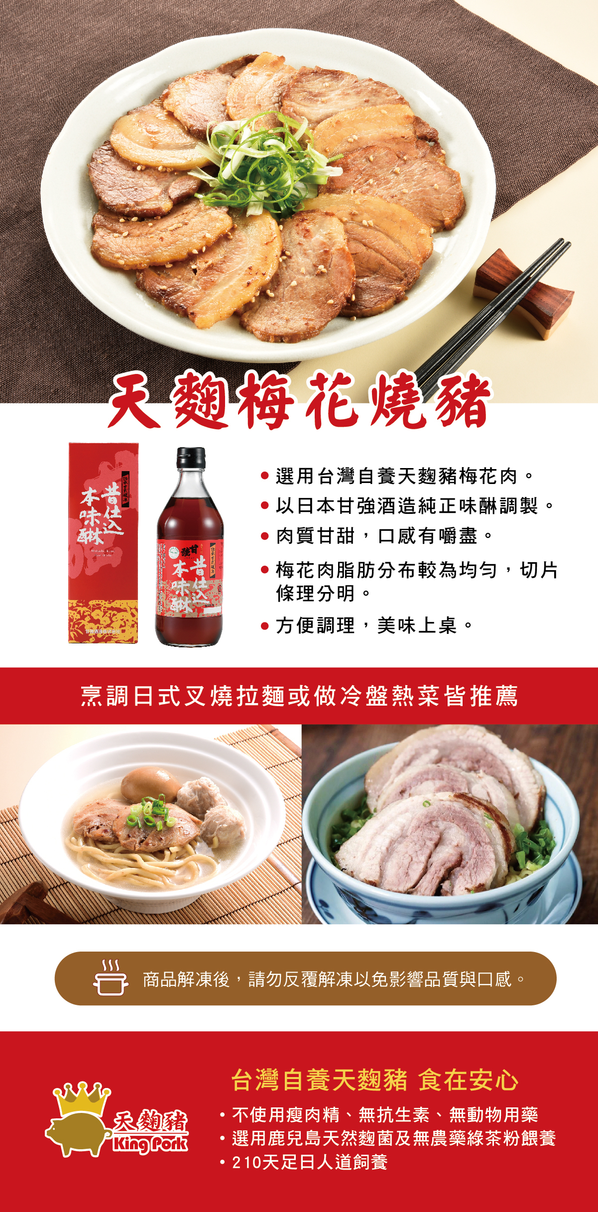 美味的天麴梅花燒豬,可用於拉麵上的叉燒肉,或做冷盤熱菜的燒豬料理,天麴豬梅花肉,不惜成本使用日本純正味醂調製,肉質甘甜口感棒,梅花肉切片條理分明。