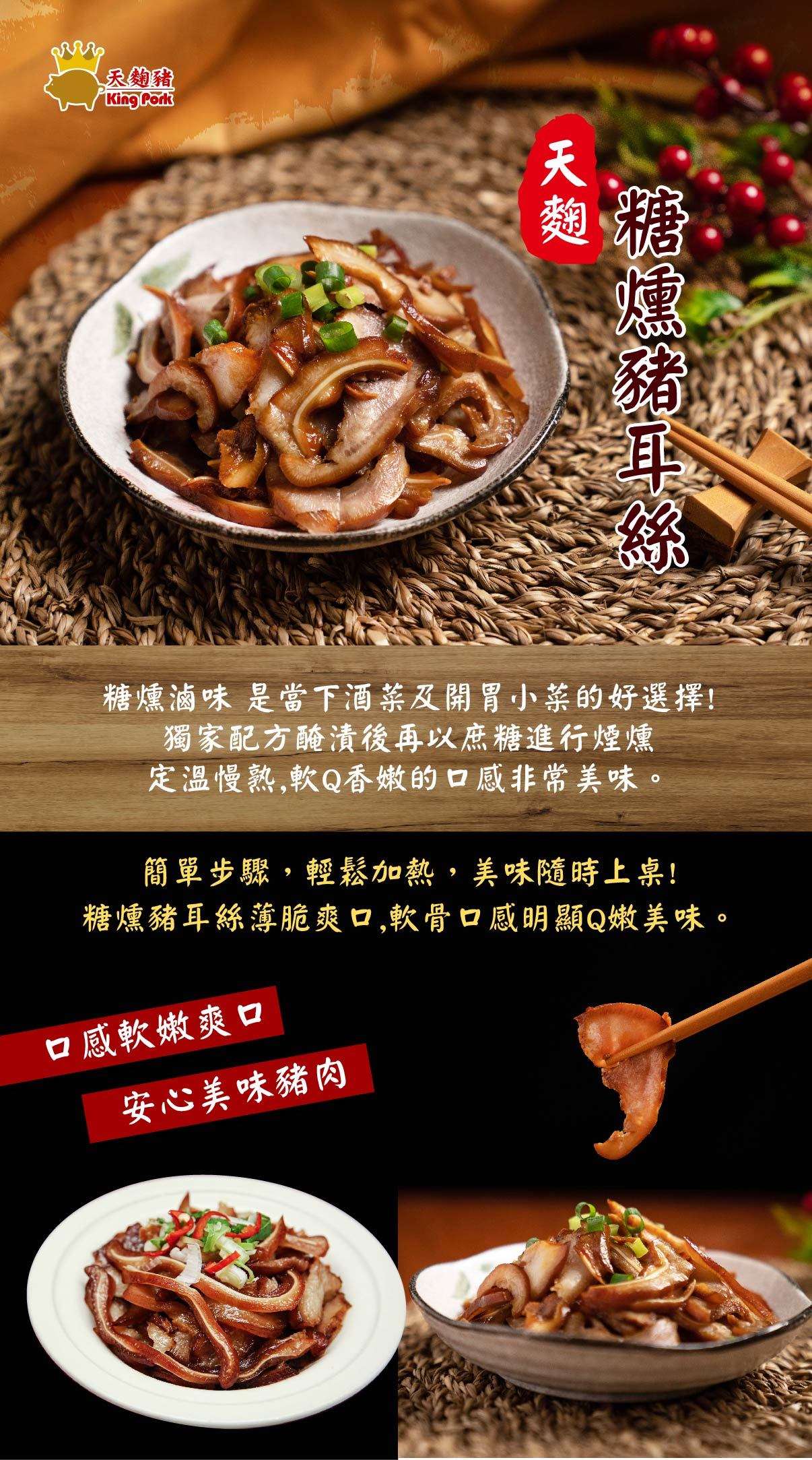 煙燻豬耳絲薄脆爽口、切薄如絲,軟骨口感明顯,是三五好友或家庭餐會時的小菜好選擇,尤其是當下酒菜十分對味。本產品使用獨家配方醃漬後再以庶糖進行煙燻,定溫慢熟,軟Q香嫩的口感非常美味。
