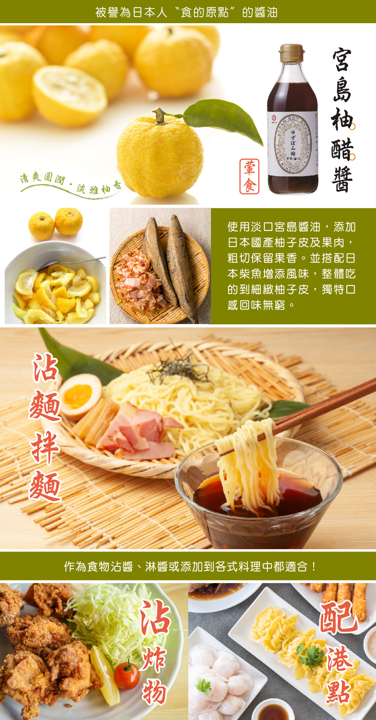 淡口宮島醬油,添加日本柚子皮、果肉及鰹魚片,獨特口感回味無窮。