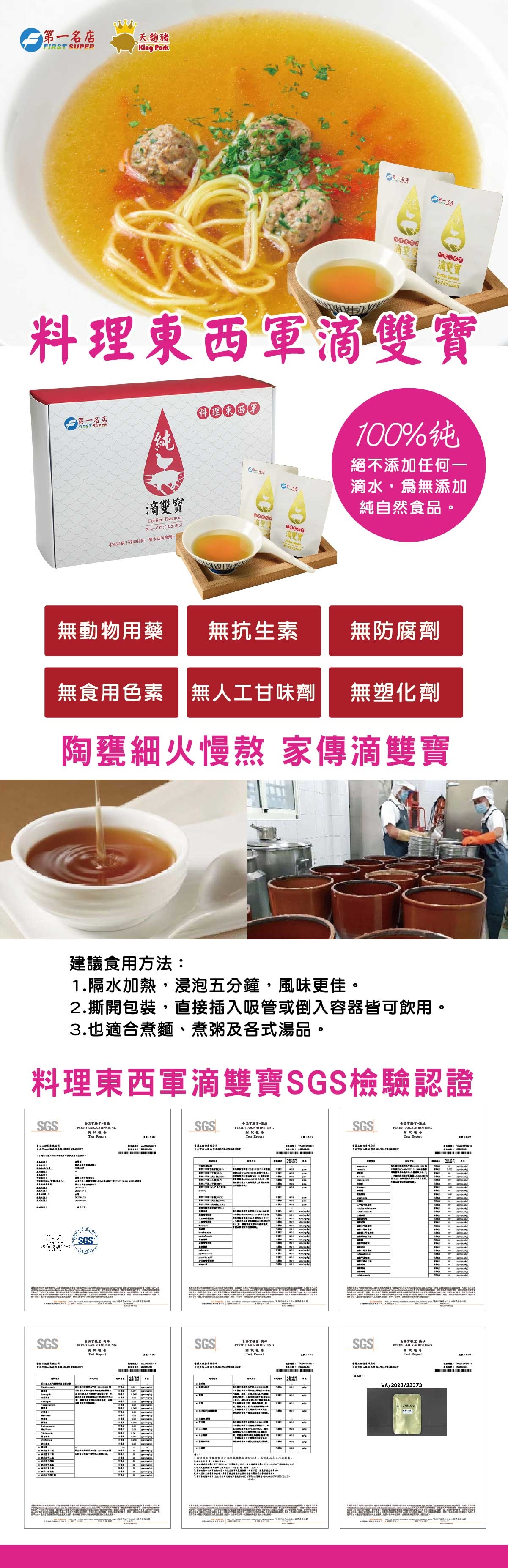 使用古法陶甕熬製不參雜任何調味,喝起來有濃濃古早味,第一名店團隊技術創新研發「料理東西軍滴雙寶」,結合台灣自養天麴豬,精選雞肉精華,營養美味滿分。