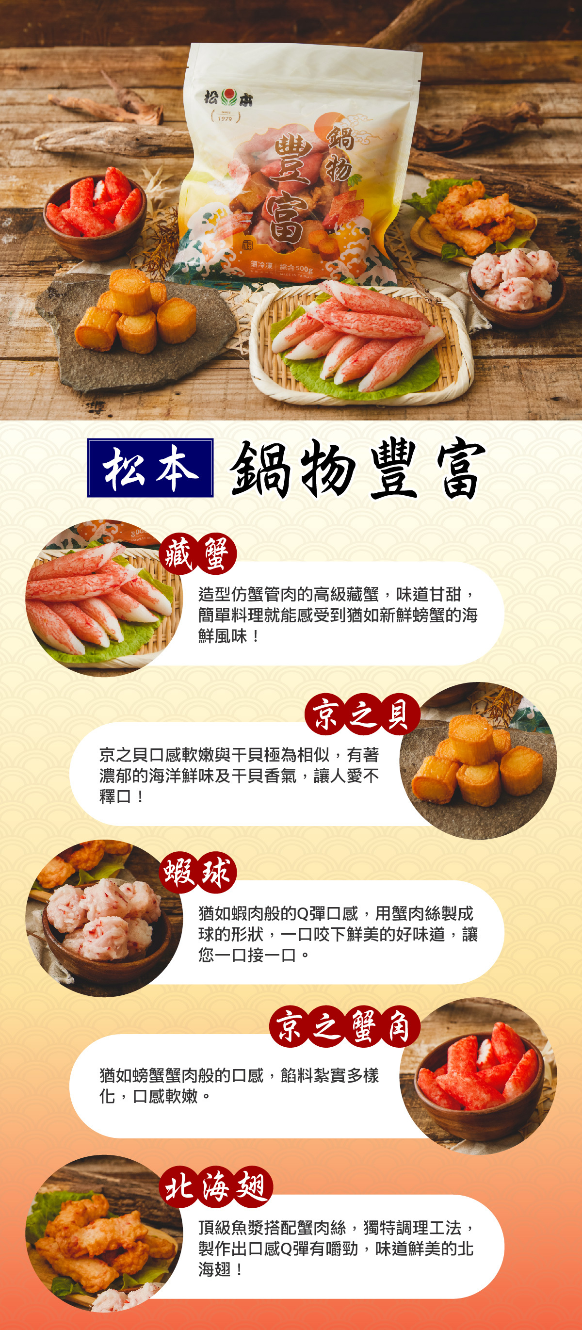 (1)內含五種鍋物:京之貝、京之蟹角、藏蟹、蝦球、北海翅,豐富美味。