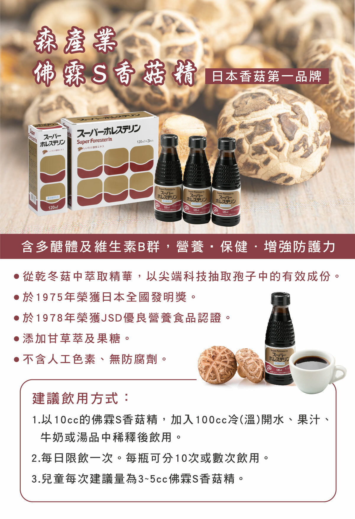 佛霖S香菇精於1975年榮獲日本全國發明獎,於1978年榮獲JSD優良營養食品認證。