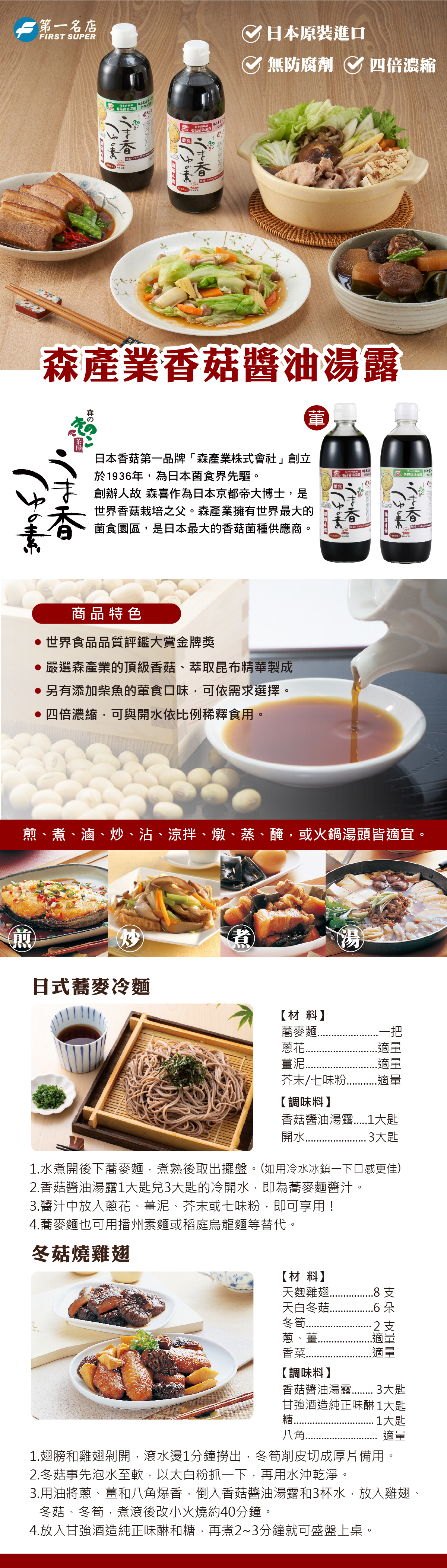 2.嚴選原料:(1)歷經半年發酵熟成的純釀造醬油 (2)日本菇類研究權威—森產業出品的頂級香菇 (3)富含礦物質的優質昆布