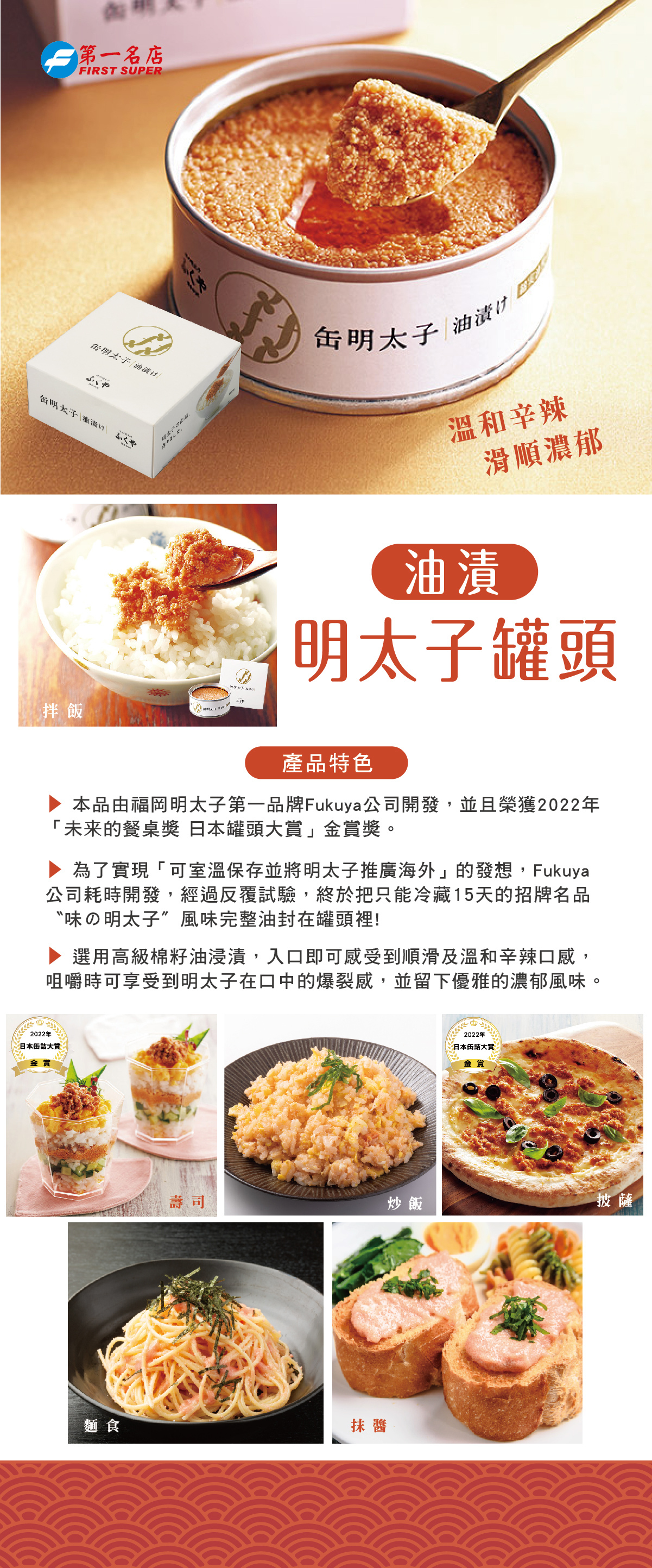 (3)本品由福岡明太子第一品牌Fukuya公司開發,並且榮獲2022年「未来的餐桌獎 日本罐頭大賞」金賞獎。