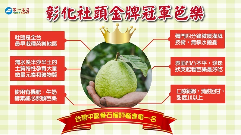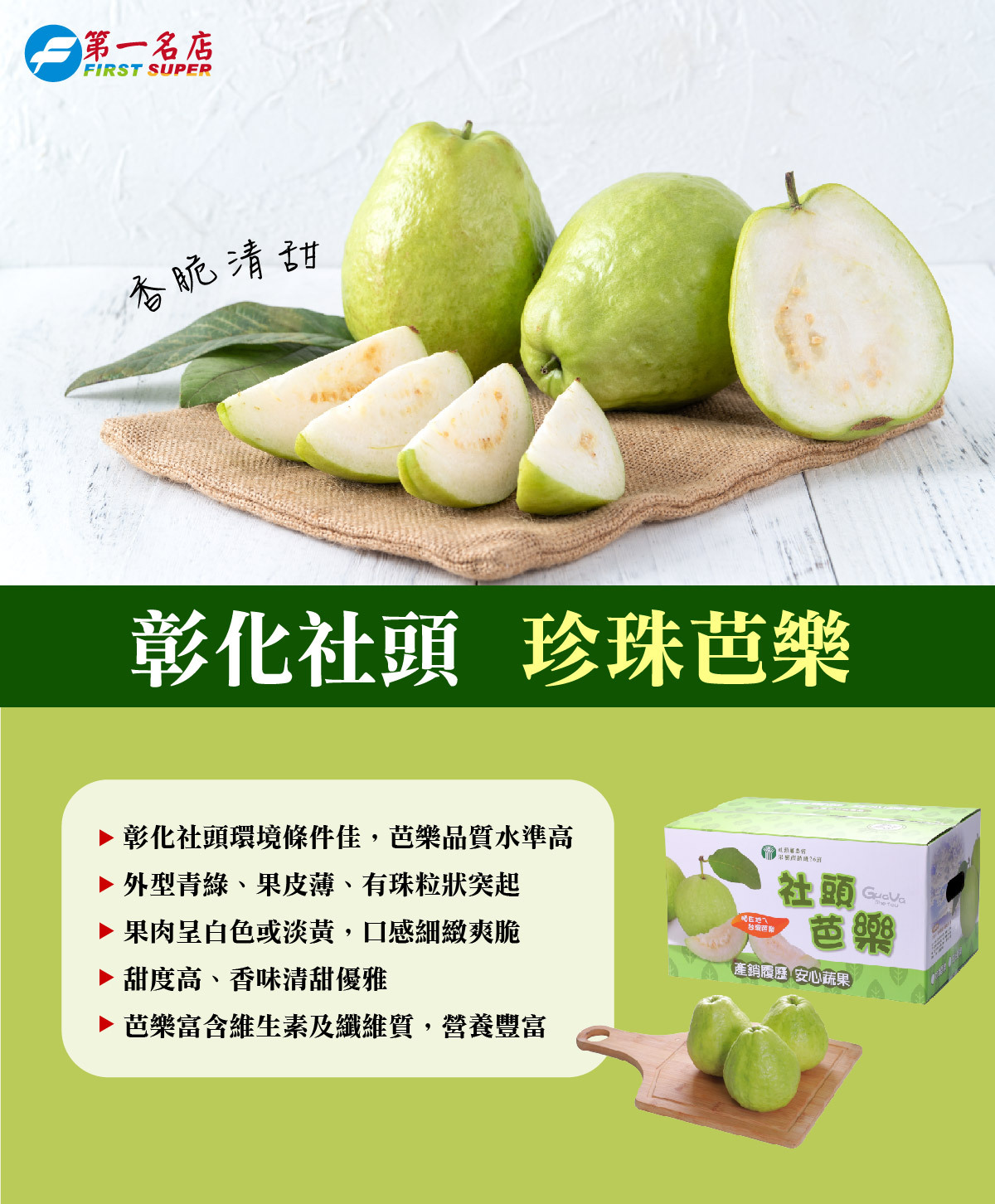 第一名店嚴選社頭的珍珠芭樂,果皮薄,有珠粒狀突起,果肉呈白色或淡黃,口感細緻脆爽,香甜優雅,營養豐富。