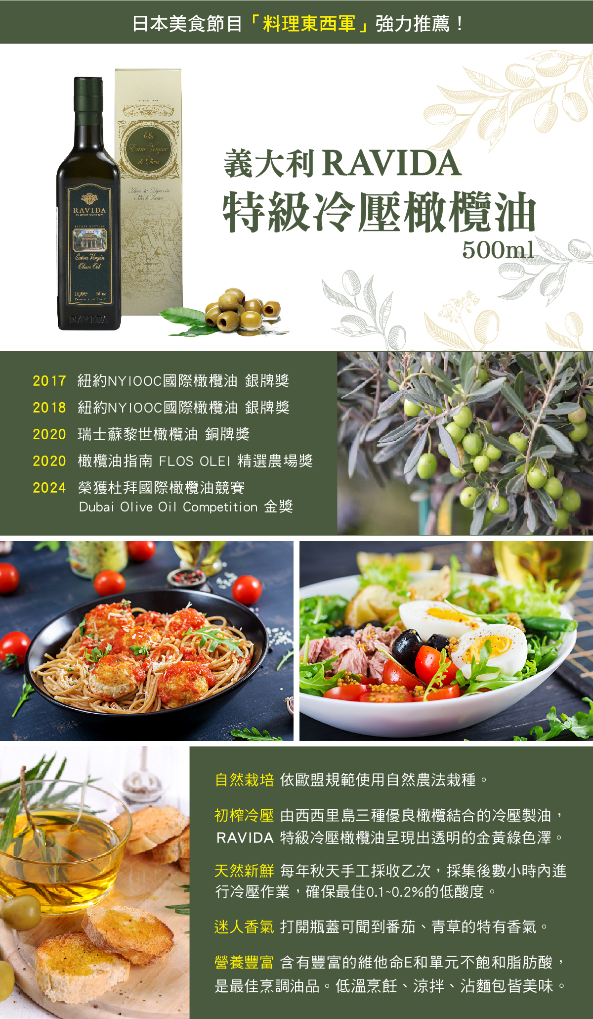 自1773年以來,義大利RAVIDA家族農莊以傳統手工方式採收,限量製造世界最高品質之橄欖油。多年來榮獲各項國際大獎,RAVIDA家族更被國際橄欖油協會稱為“西西里島最優秀的橄欖油製造商”。