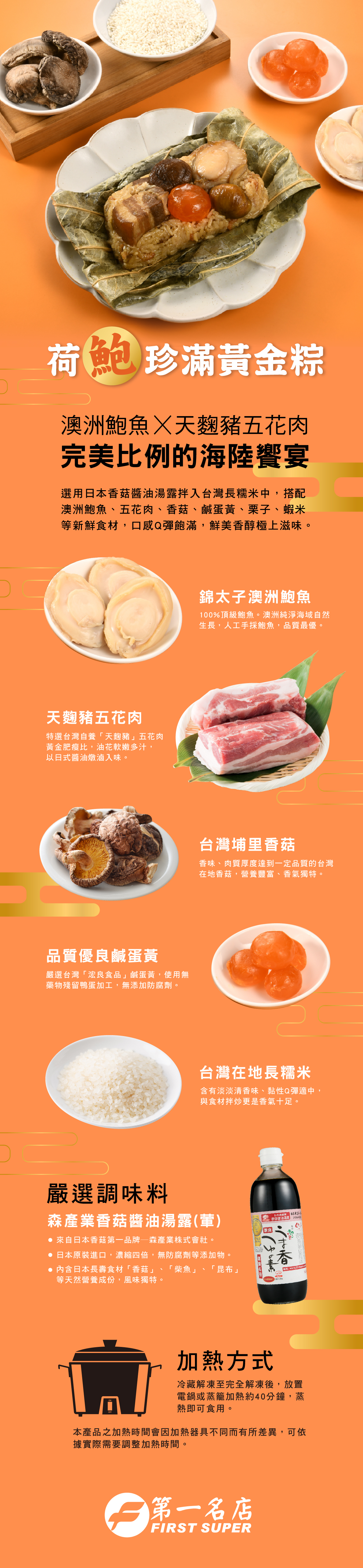 成 分:水、五花肉、長糯米、蝦米紅蔥(大豆油、紅蔥頭、蝦米)、香菇醬油湯露[純釀造醬油(大豆、小麥、食鹽)、水、糖類(砂糖、果糖葡萄糖糖漿)、水解蛋白(大豆、玉米)、食鹽、鰹柴魚片、香菇萃取物、昆布萃取物、調味劑(L-麩酸鈉)、酒精、焦糖色素(普通焦糖) ]、鹹蛋黃、沙拉油、蔥頭醬(蔥頭、棕櫚油、大豆油)、鮑魚罐頭[水、鮑魚、檸檬酸鈉、食鹽、抗氧化劑(異抗壞血酸鈉)]、紅蔥油(大豆油、紅蔥頭)、冷凍栗子、益味優SP(氯化鈉、胺基乙酸、DL-胺基丙酸、琥珀酸二鈉、乳糖、5-次黃嘌吟核苷碗磷酸二鈉、5-鳥嘌吟核苷磷酸二鈉、麥芽糊精)、特細砂糖、鉅利老抽[糖、水、焦糖色素、食鹽、脫脂大豆片(非基因改造)、小麥]、鈕扣菇、白椒粉、荷葉(中)。