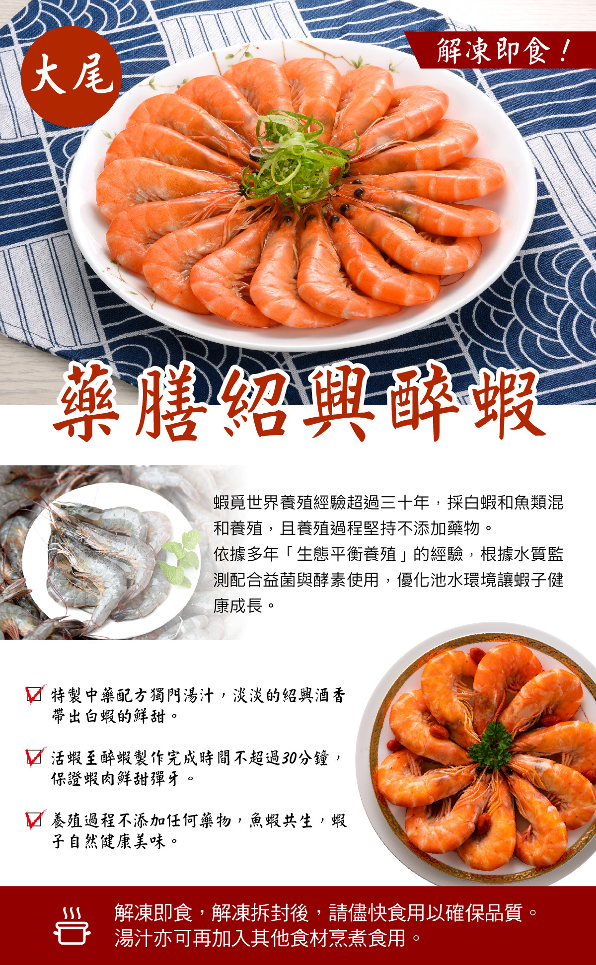 成 分:現撈活白蝦、水、紹興酒、鹽、冰糖、當歸、 枸杞、 黃耆、紅棗、桂枝、川芎